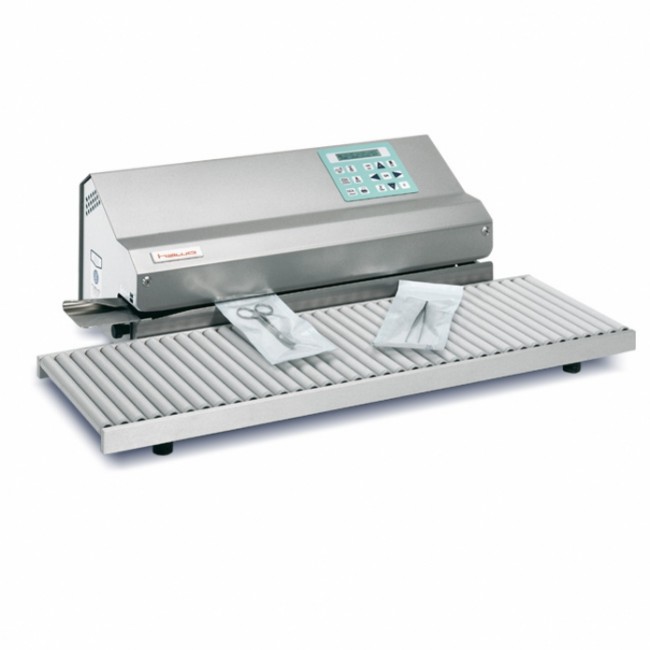 Сваривающий прибор непрерывного действия с 1-строчным компьютеризированным матричным принтером. Система проверки качества шва. Корпус из хромированной стали. Скорость протяжки примерно 10 м/мин. Подходит для сварки упаковок любого типа, в том числе материала Tyvek.