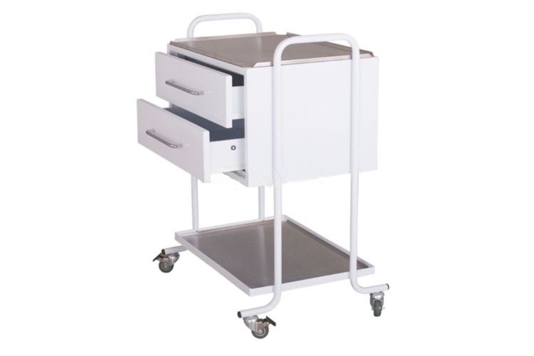 Металлический столик с двумя выдвижными ящиками.